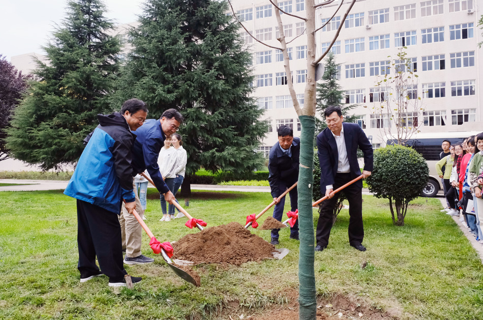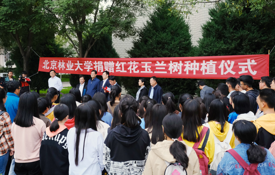 活动中,北京林业大学为学校捐赠一批红花玉兰树种。双方校领导共同为红花玉兰树培土。