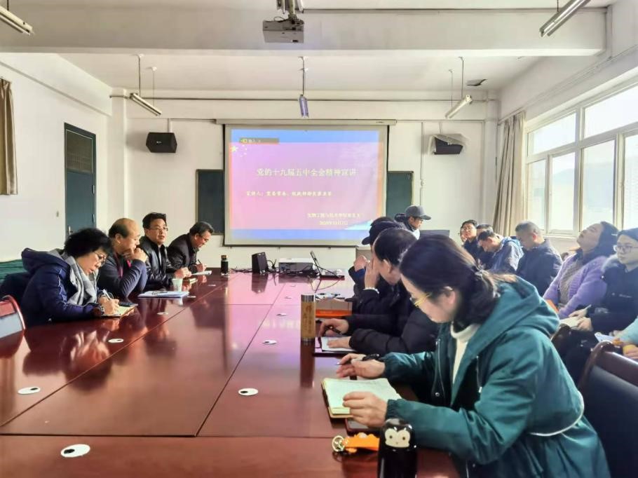 12月3日下午,beat365中文唯一官网在414会议室召开全体教职工大会,邀请校党委常委、统战部部长崔亚军作学习贯彻党的十九届五中全会精神宣讲报告,党总支书记马纲主持会议。