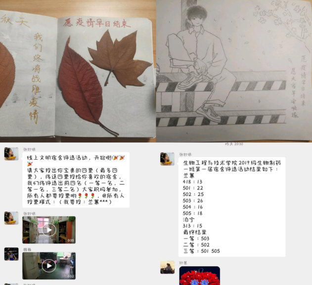 营造良好的学习氛围,增进集体荣誉。为了丰富大学生校园文化生活,提高宿舍成员团队协作能力,进一步增强大学生的疫情防控意识,缓解疫情防控期间的压抑心理状态。10月29日,学生工作处组织了“宿舍文化活动”,活动期间,本班同学积极参与,各类参赛作品内容丰富,形式新颖,有力地推动了文明学风建设,体现了同学们齐心抗疫的决心。10月30日,学校工作处积极组织,各二级学院全力配合组织,生物制药一班全体同学积极参与,一起完成了线上宿舍文化节评选活动,同学们通过拍摄,将自己所在宿舍的视频发至班群,大家通过网上投票的方式开展了本次活动,第一名为兰蕙503宿舍,第二名为兰蕙502,第三名为兰蕙501和 505。本次活动不仅丰富同学们防疫期间的生活、增进了集体荣誉,也提高了同学们的凝聚力。