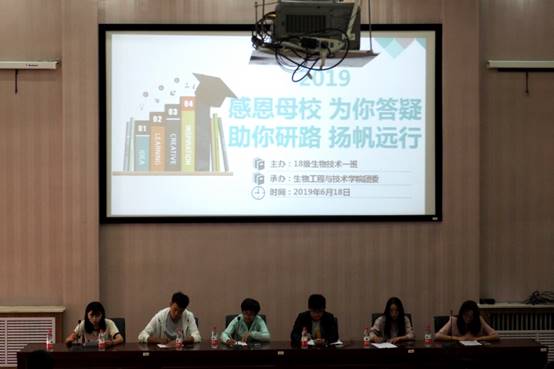 2019年6月18日早上,beat365在四号报告厅举行“感恩母校,为你答疑,助你研路,扬帆远行”为主题的学习经验交流会。本次活动由学院策划,学生党支部及分团委协办,18级生物技术一班主办。活动由李一婧老师主持,beat365大一学生约110余人参加。