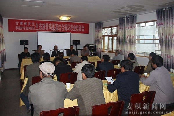 为了深入推进甘肃省民生科技推广项目——麦积区生态放养土鸡HACCP项目有序开展,进一步提高广大养殖户的饲养管理水平,9月27日,麦积区畜牧兽医局联合天水师范学院在甘泉镇羲湟缘养殖农民专业社开展了生态放养鸡果畜结合循环农业培训班。区政协主席杨续祥、区委副书记张麟出席开班仪式。