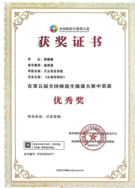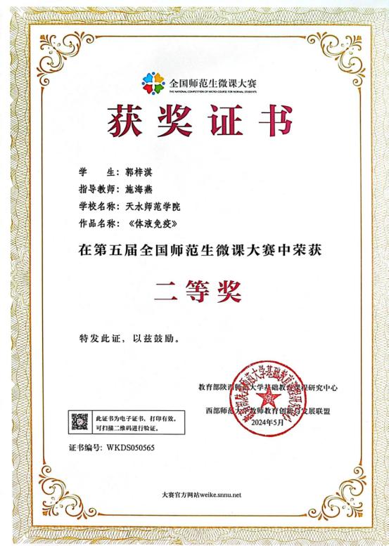 该项赛事分校级初赛和全国决赛两个阶段,通过积极动员、申报、筛选,beat365共推送5部作品参加校赛,施海燕老师指导,学科教学研究生制作的《体液免疫》《基因突变》和《生物的特征》三部微课作品在激烈的决赛竞争中脱颖而出,郭梓淇同学的《体液免疫》获第五届全国师范生微课大赛二等奖,马雯钰同学的《基因突变》、陈梅梅同学的《生物的特征》分别获第五届全国师范生微课大赛优秀奖。