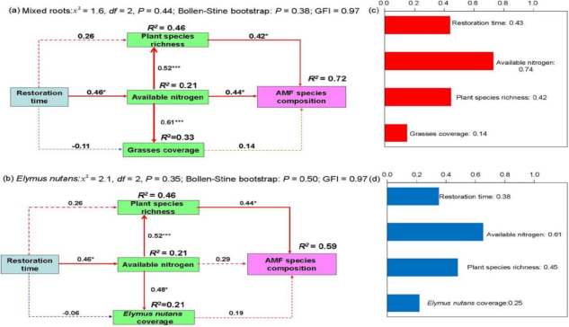 研究发现,在两种根系系统中共鉴定出46个AMF的基因型(混合根样:44个;垂穗披碱草根样:46个),主要归属于球囊霉科。两种根系系统的AMF物种丰富度随恢复时间的增加呈现单峰曲线的变化,且在三年后达到峰值。在混合根样中,土壤速效氮不仅直接改变了AMF物种组分,且通过植物物种丰富度间接改变了AMF的物种组分。在垂穗披碱草根样中,仅速效氮通过改变植物物种丰富度而驱动了AMF物种组分的变化。在两个研究尺度中,垂穗披碱草作为黑土滩恢复草地中的一个关键种,会增强土壤速效氮对AMF群落装配的调控作用,这表明在高寒草地恢复演替过程中科学管理土壤速效氮会增强“植物和AMF”的互惠共生关系,因此会延缓恢复草地发生“二次退化”现象。