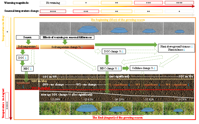 气候变暖和季节对土壤有机碳(Soil Organic Carbon, SOC)的影响已经受到了广泛的关注。但是,气候变暖如何影响SOC的季节变化仍然不确定。beat365、中科院西北高原生物研究所和兰州大学联合研究团队在海北高寒草甸生态系统定位研究站设立了一个梯度增温长期实验,用以调查同生长季开始(五月)和结束(八月)时与SOC存在潜在相关的植物属性、土壤理化性质和微生物性质。研究发现,八月的SOC低于五月,且SOC的储量在八月平均减小了18.53 Mg C/ha。不考虑季节,实验增温并未改变SOC的含量,且未影响生长季期间SOC的变化。在所有测量的变量中,微生物生物量碳是与SOC变化高度耦合的变量。在生长季期间,高寒草甸土壤是碳源,但是气候变暖并未对其造成显著影响。研究表明,在高寒草甸生态系统中对土壤碳源或汇的调控需要更多地关注生长季期间SOC的改变,而不单纯是气候变暖。
