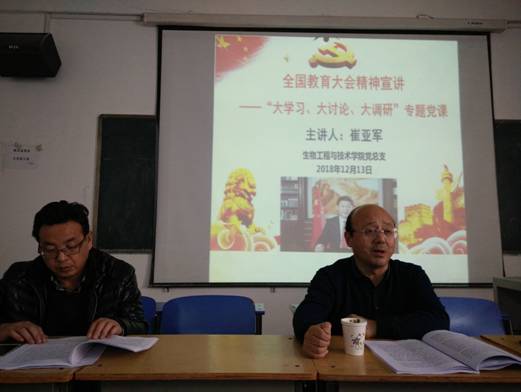 2018年12月13日,beat365举办“大学习、大讨论、大调研”活动专题党课,特邀学校党委常委统战部部长崔亚军同志讲授学习贯彻全国教育大会精神宣讲报告,beat365全体教职工和学生党员及学生班干部参加报告会。会议由马纲书记主持。